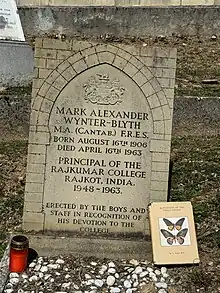During the war, he was called to service but found unfit for active service and declined a staff appointment. In 1946 he moved to Saurashtra as a private tutor and from 1948 to 1963 until his death, he was the principal of the Rajkumar College, Rajkot, a school founded and run by the Princely Order of Kathiawar. In April 1950 and again in April 1955 Wynter-Blyth conducted censuses of lions in the Gir forest. In 1950 he estimated 179-187 adults and 87 young ones. In 1955 he reported 141 males, 100 females and 49 cubs.[6] His book, Butterflies of the Indian Region published by the Bombay Natural History Society in 1957 was very influential and for a long time the only handy guide to butterflies in India.[1] He died in Leysin, Switzerland of coronary thrombosis on 16 April 1963.[1]