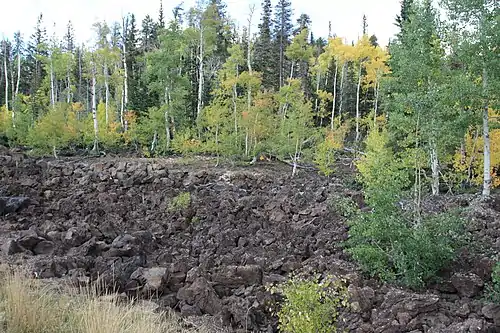 Aside from volcanism, landsliding, aeolian,[41] alluvial fan and floodplain sedimentation took place in the area, beavers built beaver dams on watercourses[42] and peat accumulated at several sites.[41] During the Pleistocene, the Bull Lake glaciation and the Pinedale glaciation took place on the Markagunt Plateau[43] and eroded and buried some lava flows.[44]