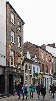 The notable buildings on the street lie on the south-eastern side: 15 Market Street is a four-storey, mid-19th century building, while 21 Market Street is early 18th-century, and the Burns Hotel is mid-19th century.[2][4] Conversely, the modern buildings at 8-10 Market Street and 20 Market Street are labelled "poorer examples" by the City of York Council.[3]