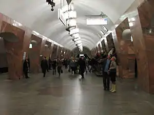 Architects Nina Alyoshina, V. Volovich and N. Samoylova took a standard deep level column tri-vault station (engineers Ye. Barsky, I. Zhukov and Yu. Muromtsev) and applied on overall red theme that includes red Burovshina marble to the columns and a pink Gazgan to the station walls. The spiral-shaped light fixtures symbolize "spiral development", a concept in dialectical materialism, the Marxist philosophical teaching.[1]