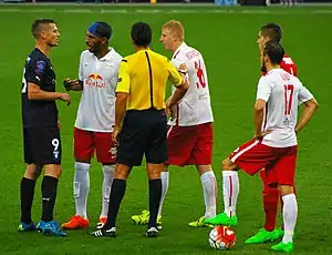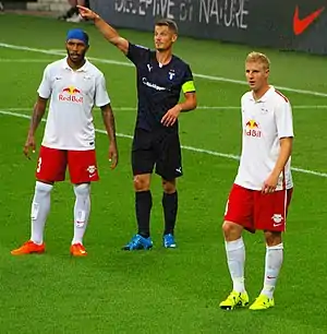 Ahead of the 2015 season, it was announced that Rosenberg was the new captain for Malmö FF, succeeding Molins.[285] Rosenberg started the season well scoring two goals in the four Svenska Cupen matches.[286][287] In a 4–1 win against GIF Sundsvall in the opening game of the season, he scored and set up the club's second goal of the game.[288] Having been linked a move away from Malmö FF earlier in the season, Rosenberg put the transfer rumours aside when he signed a contract extension with the side, keeping him until 2017.[289][290] From the start of the 2015 season, Rosenberg retained his first team place as well as his captaincy of the side.[291][292][293][294][295] He only scored two goals in the next three months, which came against Hammarby on 20 April 2015 and another came against Åtvidabergs on 31 May 2015.[296][297] Between mid–July and August, Rosenberg began a goal scoring spree, adding eight goals to his tally.[298][299][300][301][302] One of the goals came in Malmö's 3–0 return leg win over Red Bull Salzburg in the third qualifying round for the 2015–16 UEFA Champions League on 5 August 2015.[303] Thanks to an aggregate score of 3–2, Malmö eliminated Salzburg for the second successive season, contributing to Salzburg's run of eight unsuccessful attempts to qualify for the Champions League since being purchased by the Red Bull company in 2005.[304][305] In their home match on 25 August 2015, Rosenberg scored the first goal as Malmö defeated Celtic 2–0, winning 4–3 on aggregate and thereby qualifying for the Champions League group stage for the second consecutive year.[306][307] He later scored four more goals later in the 2015 season, including a brace against Kalmar on 17 October 2015.[308][309][310] After serving a one-match suspension, Rosenberg returned to the starting line-up in the last game of the season against IFK Norrköping, only to be sent off in the 5th minute of the match, as Malmö lost 2–0.[311][312] Malmö FF were unable to follow up their success in European qualifying with a league title in 2015, disappointingly finishing in fifth place.[313][314] Having been out of the first team on three occasions during the 2015 season,[315][316][317] Rosenberg finished the season with 42 appearances and 16 goals in all competitions.