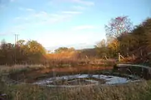 Coal was also mined from Blackburn Fell Drift,[8] on the other side of the Stanley road, which was served by the Bowes Railway. It had a relatively short life compared to the deep mine, being driven in 1937 and closing in 1979, with the men transferring to Marley Hill. In contrast to those of its neighbours, the surface buildings of this mine (including stables for the pit ponies) survived in a derelict condition for over twenty years, and the partially blocked entrance to the drift itself, (with tub lines emerging from it) was still visible beneath one of them right up until they were finally removed in the early 21st century. Although the main surface structures are gone, a small hut made from the yellow bricks characteristic of many local colliery buildings stands on the hill overlooking the site of the drift, on the opposite side of Birklands Lane. Its windows and door have been bricked up, and a small chimney-like structure which appears to be some kind of vent projects from the roof at one end. Looking from the point where the drift emerged, (and assuming the drift ran in a relatively straight line) this structure appears to sit directly above the main roadway. It is therefore a possibility that it housed pumps or an emergency access shaft, or both. This structure does not appear on the 1921 OS map, but is visible on the map from 1951 (the area is not covered on the 1938–39 map), so it is probably safe to assume that it is in some way associated with the drift. The trackbed of the Bowes Railway on this side of the Stanley road is now a cycle path, and continues from the site of the drift's screens, past Birkheads Cottages and the adjoining Birkheads Secret Gardens][9] and on to Kibblesworth, where the next colliery on the line was situated.