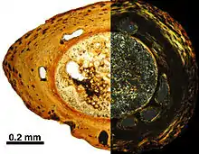 Cross section of a Marmorerpeton femur in normal transmitted (left) and polarized (right) light