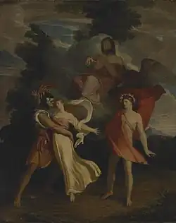 Marpessa was a beautiful lady, described as being "fair-ankled".[4] Idas, son of King Aphareus, came from Messenia to ask for the hand of Marpessa, but Evenus refused his request because he wanted his daughter to remain a virgin. Idas went to his father Poseidon and begged for the use of a winged chariot.[5] After Poseidon consented to his use of the chariot, Idas kidnapped Marpessa and carried her away from a band of dancers and to Pleuron in Aetolia.[6] Her father, after chasing the couple for a long time, realized that he could not catch up to them. In his madness, he killed his horses and then drowned himself in a nearby river Lycormas and became immortal. The river was named later after him.[7]