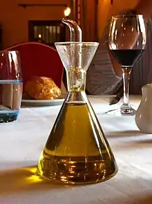 The Marquina non-drip oil bottle or cruet (in Catalan: setrill antidegoteig de Marquina, in Spanish: aceitera antigoteo de Marquina) is a transparent and conical cruet designed to contain oil or vinegar without dripping or dirtying, and was designed by Rafael Marquina in 1961. The sales success of this model has led to countless plagiarisms of its design, motivated by the expiration of the patent years ago.[1][2][3]