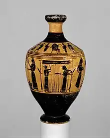 The proaulia was the time when the bride would spend her last days with her mother, female relatives, and friends preparing for her wedding. The proaulia was usually a feast held at the bride's father's house. During this ceremony, the bride would make various offerings, called the proteleia, to gods such as Artemis, Athena, and Aphrodite. "Toys would be dedicated to Artemis by adolescent girls prior to marriage, as a prelude to finding a husband and having children. More significant as a rite of passage before marriage was the ritual of the cutting and dedication of a lock of hair."[37] It is also likely that she would have offered the girdle worn since puberty to these goddesses.[11] These offerings signified the bride's separation from childhood and initiation into adulthood. They also established a bond between the bride and the gods, who provided protection for the bride during this transition.