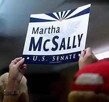 McSally won the August 28 Republican primary with 53 percent of the vote and faced Democratic nominee Kyrsten Sinema in the November general election.[49] The general election remained undecided for several days after election night until all ballots were counted in the close contest.[50] McSally held a lead by the end of election night, but it narrowed over the next few days as more ballots were counted.[50] During this time, both McSally and Sinema voiced support for counting all the ballots.[50] There was no evidence of any fraud.[51] On November 12, McSally conceded to Sinema, congratulating her on becoming Arizona's first female senator. Sinema won by almost 56,000 votes.[52][53] In May 2021 former deputy campaign manager Anthony Barry pleaded guilty to the theft of $115,000 campaign funds from the McSally campaign.[54]