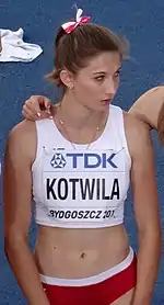 Martyna Kotwiła (born 13 January 1999) is a Polish sprinter.[2] She won a bronze medal at the 2018 World U20 Championships. In 2018, she ran 22.99 in the 200 metres breaking the long-standing Polish junior record previously held by Irena Kirszenstein.