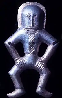 The hoard includes four anthropomorphic silver figurines of 'dancing men' (Ukrainian newspapers sometimes refer to them as 'aliens' for their unusual appearance[2]), five animal figurines, three fibulas, a radiate-head brooch, six armlets, tiaras, ear rings, neck rings, buckles, belt-fittings and horse harnesses. The style of figurines is sometimes considered as influenced by Huns, Bulgars or Avars.[3]