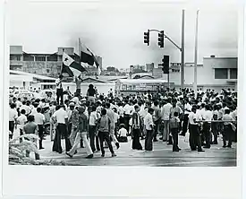 At Balboa High, the Panamanian students were met by Canal Zone police and a crowd of Zonian students and adults. After negotiations between the Panamanian students and the police, a small group was allowed to approach the flagpole, while police kept the main group back.