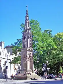 Designed by George Gilbert Scott, the monument was completed in 1843 after two years' work, having replaced "a picturesque but tottering old house". The Victorian Gothic memorial, whose design dates from 1838, has been likened to the steeple of a cathedral, though it was consciously patterned on the Eleanor crosses erected by King Edward I between 1290 and 1294 to the memory of his wife, Queen Eleanor of Castile (1241–1290). Henry Weekes sculpted the three statues of Cranmer, Latimer and Ridley.[2] The statues are carved from Caen stone while the monument itself is made of Magnesian limestone.[3] The monument is listed at Grade II*.[4]