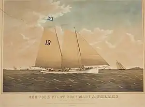 New York pilot boat Mary A. Williams was built in 1861 for the New York and Sandy Hook pilots. She was launched on January 28, 1861, from the Edward F. Williams shipyard, at Greenpoint, Brooklyn. She was 77 feet in length, 19 feet 6 inches in beam, 7 feet and 9 inches in hold (depth), measuring 57.64 tons or (106 tons register).[1] She was named Mary Ann Williams after the wife of the builder, Edward F. Williams. The launch was witnessed by a large number of friends and pilots. The boat was considered one of the finest connected with the pilot service.[2]