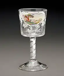 A goblet with a painted landscape scene associated with Mary Beilby, c. 1770.