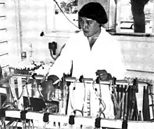 Allen was accepted as a Ph.D. student of the University of California by Sam Ruben in Berkeley.[12][13][14] Allen is listed as an assistant at the Lawrence Radiation Laboratory at the University of California in Berkeley for 1941-42[1][15] and as a chemist for the Manhattan District for 1942-44.[1] While working with Ruben, she used radioactive tracers to study photosynthesis and chlorophyll.[4][16]