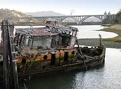 The Mary D. Hume was a steamer built at Gold Beach, Oregon in 1881, by R. D. Hume, a pioneer and early businessman in that area. Gold Beach was then called Ellensburg. The Hume had a long career, first hauling goods between Oregon and San Francisco, then as a whaler in Alaska, as a service vessel in the Alaskan cannery trade, then as a tugboat. She was retired in 1977 and returned to Gold Beach. In 1985 she sank in the Rogue River and has remained there ever since as a derelict vessel on the shoreline. The Hume is listed on the National Register of Historic Places.