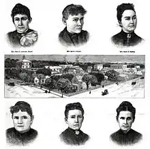 Engraving of the all-women city administration of Oskaloosa, Kansas, 1888, with a view of the city. Clockwise from upper left: Mayor Mary D. Lawson and Councilwomen Carrie Johnson, Sadie E. Balsley, Mittie Josephine Golden, Emma K. Hamilton, and Hanna P. Morse.