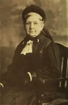 Mary Eliza Haines[5] was born in the village of Brick Meeting House (now Calvert), Maryland, January 9, 1834.[6] She was a daughter of Joseph and Harriet (Kirk) Haines.[7] On father's side, sixth in descent from Richard Haines, English Quaker,[8] who came from Oxfordshire in 1682. On mother's side, Scotch-Irish; sixth in descent from Roger Kirk, who came from Lurgen, Province of Ulster, in 1712. Both families bought tracts of land adjoining the 40 acres given in person by William Penn in 1701 on which to build the Friends' meeting house. They supposed they were in Chester County, Pennsylvania, but when, in 1763, the Mason–Dixon line was run, they found that they were in Cecil County, Maryland. Her great-grandfather, Job Haines, as member of the Maryland Legislature, attended, with other members of that body, the funeral of General George Washington.[9] In the old homestead of her parents, she grew to adulthood,[7] along with siblings, Charles (1826-1866), Cornelia (b. 1828), Lewis K. (1831-1835), William L. (b. 1825), and Reuben (b. 1840).[10]