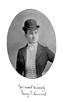 Kennard and her husband were both keen motorists and each owned an automobile. She bought a Napier eight horsepower two-cylinder, which she allowed to be entered for a 1,000-mile race by S F Edge with herself as passenger. Kennard wrote kindly of her husband's choice of the Napier, but she preferred herself to drive a De Dion voiturette. Her driving was not without incident, and she turned her car over on the tramlines in Nottingham.[11] In 1903, she published a novel called The Motor Maniac, based around the subject of automobiles. The Spectator gave it a poor review, suggesting that people who did not own an automobile would find the details of "belts, speeds, makes of car, &c... exasperating".[12] However, The Times later called Kennard "a very widely read and prolific author of the mid-eighties" who wrote "rattling good tales".[13]