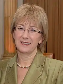 Mary Hanafin (born 1 June 1959) is an Irish Fianna Fáil politician who served as Minister for Tourism, Culture and Sport from 2010 to 2011, Deputy leader of Fianna Fáil from January 2011 to March 2011, Minister for Enterprise, Trade and Innovation from January 2011 to March 2011, Minister for Social and Family Affairs from 2008 to 2011, Minister for Education and Science from 2004 to 2008, Government Chief Whip from 2002 to 2004 and Minister of State for Children from 2000 to 2002. She served as a Teachta Dála (TD) for the Dún Laoghaire constituency from 1997 to 2011.[1]