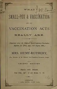 In 1876 William gave up his religious orders.[22] Ultimately, the Hume-Rotherys were less effective campaigners than William Young the chemist, allied to William Tebb and William White, who were more interested in their working-class base, and would pay fines imposed by those refusing vaccination.[25] The Hume-Rotherys had an advocate in the Member of Parliament Peter Alfred Taylor.[26] In 1881 the British Medical Journal complained that a letter on vaccination by Taylor to William Benjamin Carpenter was offensive, and a pamphlet of his "might have been written by Messrs. Hume-Rothery, Baker, Wheeler or Gibbs."[27] The NACVL was eclipsed by the London Society for the Abolition of Compulsory Vaccination in the 1880s.[12]