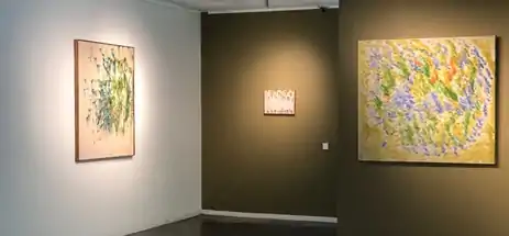 In 1961, Orwen and her family moved to West Virginia, and she, then an art instructor at Bethany College, participated in an exhibition with twelve other art teachers at Grove City College in nearby Pennsylvania.[39] Despite the move, she also continued to exhibit in at the Jefferson Place Gallery (a solo in 1967) and at the Baltimore Museum of Art (in a major review called "Twenty Years of Washington Art" in 1970).[9] Not long after the move to West Virginia, Orwen and her family moved again, this time to Geneseo, New York, and she began to show in that vicinity, starting with a show at the annual Western New York art exhibition held in March 1964 at the Albright–Knox Art Gallery. There, a painting of hers called "Sea Chant No. 4" was one of many prize winners.[40] Over the next twenty-five years, she participated in group and solo exhibitions at commercial galleries as well as museums and other non-profit organizations in the Rochester region.[9][41][42] Notable exhibitions include solo shows at the Oxford Gallery in Rochester (1974), the Rochester Branch of the American Association of University Women (1983), and the Arts and Cultural Council for Greater Rochester (1991).[9][42][43] In 1978, Watkins Gallery of American University gave her a solo exhibition. The following year and in 2001 she contributed paintings to group exhibitions in New York commercial galleries (David Findlay, 1999, and Gary Snyder, 2001).[9] In 2019, Cody Gallery, Marymount University, presented an exhibition of Orwen's paintings. The show was the second in a series called "Women of Jefferson Place Gallery". Others in the series included Jennie Lea Knight and Hilda Thorpe. Installation views from the Orwen exhibit are shown above.