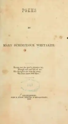 Mary Scrimzeour Whitaker (née, Furman; after first marriage, Miller; after second marriage, Whitaker; February 22, 1820 – March 12, 1906) was an American litterateur, author, poet, essayist, novelist, and critic. Born in South Carolina, she became a writer of New Orleans. Her written works include Poems and Albert Hasting, the first Southern novel published after the American Civil War. She was a typical "daughter of the South", and in everything she wrote, this characteristic was evident. After completing her education in Europe, she almost immediately began writing for magazines and Northern periodicals, contributing thousands of articles to the press. One of her most widely copied poems was a classic called the "Sacrifice of Iphegenie"; another, "Farewell to Scotland", thought written when she was but eighteen years of age, is a good example of her poetic productions.[1]