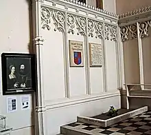 The funeral procession included 100 torch bearers, clergy carrying the cross, six horses pulling the hearse, other nobility and 100 of the duke's yeomen.[87] A requiem mass and burial at Bury St. Edmunds Abbey followed the next day.[88] At the funeral, her step-daughters, Anne and Mary, pushed themselves to the head of the cortège just before the coffin was lowered into the crypt of the Abbey, much to the consternation of their half-siblings.[89]
