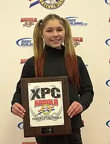 Maryana Naumova is the first female under-18 to be allowed to participate in professional powerlifting tournaments.[4] In March 2015, she participated in the Arnold Classic, establishing the female record in the event Arnold BenchBach, lifting 150 kg (330 lb). After the tournament she asked Arnold Schwarzenegger to become the President of the United States and normalize Russia–United States relations. She also passed Arnold letters from Donbas children.[4] She said that Arnold Schwarzenegger is a very important person in her life.