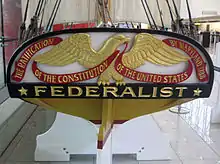 The merchants of Baltimore celebrated Maryland's ratification of the United States Constitution on April 28, 1788, by building a 15-foot (4.6 m) miniature ship called Federalist.[1] The ship was designed by Joshua Barney, a native of Baltimore and commodore in the United States Navy.[2] Federalist was the centerpiece of a parade in Baltimore before being sailed by Barney down the Chesapeake Bay and up the Potomac River to Mount Vernon to be presented as a gift to George Washington.[3] According to Washington's diary, Barney arrived on June 8, 1788.[4] Federalist sank in a "hurricane" on July 24.[5]