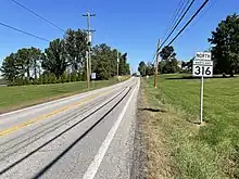 Maryland Route 316 (MD 316) is a state highway in the U.S. state of Maryland. Known as Appleton Road, the highway runs 2.67 miles (4.30 km) from MD 279 near Elkton north to MD 277 near Elk Mills in northeastern Cecil County. MD 316 was constructed in the early 1910s from Elkton to Elk Mills and in the early 1920s north of Elk Mills. In the early 1960s, the disjoint northern segment of the highway was transferred to the county and the highway's present southern terminus was established when MD 279 moved to a new alignment north of Elkton in the early 1960s.