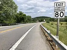 Fingerboard Road from Urbana to Centerville just east of modern Carriage Hill Drive was built as a treated earth road between 1933 and 1935.[12][13] This semi-modern road was completed east to MD 75 in 1936.[14] The final section of MD 80 from Buckeystown to Urbana was constructed as a concrete road around 1938.[15][16] The Urbana–Fingerboard highway was widened and resurfaced between 1950 and 1952.[17] MD 80's interchange with the new Washington National Pike (now I-270) was also constructed in that time span. Shortly thereafter, MD 80 was widened between US 240 and the new freeway.[18] The old highway with which MD 80 passed through the center of Urbana became US 240 Alternate in 1954 and MD 355 in 1955.[19][20]