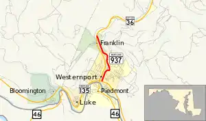 Maryland Route 937 (MD 937) is an unsigned state highway in the U.S. state of Maryland. The state highway runs 1.53 miles (2.46 km) from MD 135 north to MD 36 within Westernport. MD 937 is the old alignment of MD 36 through Westernport in the Georges Creek Valley of western Allegany County. The state highway was designated when MD 36 moved to a new alignment through the community in the early 1980s.