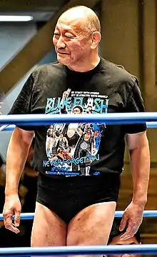 Masanobu Fuchi (渕 正信, Fuchi Masanobu, born January 14, 1954) is a Japanese professional wrestler currently signed to All Japan Pro Wrestling (AJPW), where he is also a director and the co-head booker.[1] Fuchi has exclusively worked for All Japan since his debut in 1974, and holds the record for the longest World Junior Heavyweight Championship reign at 1,309 days. Fuchi became a freelancer in 2009, but officially re-signed with AJPW in 2013 as both a director and wrestler, making him the longest tenured member of the All Japan roster.