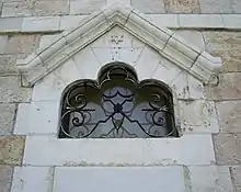 The ironwork front gate hangs between two pillar piers with a scrollwork overthrow bearing the date of construction, 1908.[3][10] According to Kroyanker, the gate is in the style of 17th-century Georgian architecture.[8]