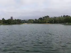 Mason Park straddles Culver Drive and is thus split into two parts. The east side of the park is a wilderness area. It features scrub-covered ground, traversed by a bike trail and a small creek. As it is located on the northern edge of the San Joaquin Hills, the terrain is rugged: the south edge is a large palisade, marking the edge of the park. The west side of Mason Park is more like a typical park than the east side. Though a ring of wilderness surrounds this side, it is mostly flat grassland, with an occasional hill or rise. An artificial lake about 900 ft (270 m) wide and 800 ft (240 m) long in the center of the park is often home to migrating birds and other local wildlife.