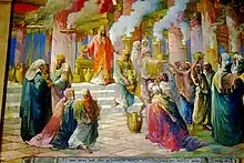 German-born mural artist Gustave A. Brand (1862-1944) was commissioned to create twenty-two giant paintings for the two Masonic lodge meeting rooms of the Muncie Temple.[6] These huge 12' x 14' paintings depict scenes from both the Old and New Testaments of the Bible, and several feature King Solomon and Solomon's Temple in Jerusalem. The scenes were painted on canvas and are permanently affixed to the walls on all four sides of the lodge rooms.