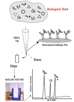 An illustration of the MSIA procedure is depicted in the figure to the right. Analytes in a biological liquid sample are collected from solution by using a MSIA tip (also known as MSIA microcolumns[8]) that contains a derivatized affinity frit. Biological samples contain various proteins that span a wide dynamic range so purification is needed to minimize the complex matrix and maximize mass spectrometry sensitivity.[9] the MSIA tip serves as a place to purify these samples by immobilizing the analyte with high selectivity and specificity. Analytes are bound to the frit based on their affinities and all other nonspecific molecules are rinsed away. The specific targets are then eluted on to a mass spectrometer target plate with a MALDI matrix. However, proteins may be digested prior to ms analysis. A MALDI-TOF-MS later follows and targeted analytes are detected based on their m/z values. This method is qualitative, but the addition of mass shifted variants of the analyte for use as an internal standard makes this method useful for quantitative analysis.[5]