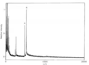 An early MSIA experiment was done on a venom laced human blood sample for the Antigen myotoxin. The experiment was successful in that the mass spectrum resulting from the analysis showed a distinct response for myotoxin at the molecular weight corresponding to 4,822 Da (a).[1] The m/z ratio at 5,242 Da (b) is the molecular weight of the modified variant H-myotoxina, used as an internal reference species. The figure of the mass spectrum is shown below.