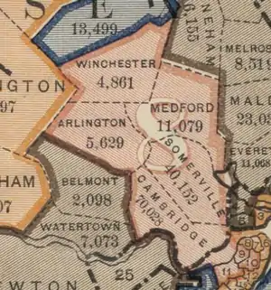 1943–1953 Everett, Lynnfield, Malden, Medford, Melrose, N. Reading, Reading, Saugus, Somerville (Wards 4, 5, 6, 7), Stoneham, Wakefield.[13][17] |