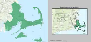Massachusetts's 9th congressional district is located in eastern Massachusetts. It is represented by Democrat William R. Keating. With a Cook Partisan Voting Index rating of D+6, it is the least Democratic district in Massachusetts, a state with an all-Democratic congressional delegation.[2]