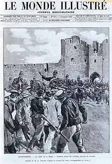 Despite the intervention of a justice of the peace and gendarmes, the situation rapidly deteriorated.[5] Some trimards reached Aigues-Mortes and said that the Italians had killed some local Aiguemortais, causing their ranks to grow from the local population and workers who had been unable to secure employment.[5] A group of Italians was then attacked and had to take refuge in a bakery that the rioters wanted to set fire to. The prefect called in troops at around 4 o'clock in the morning; they did not arrive on the scene until 6 pm, after the drama.[6]