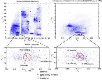 A strong 1:2 orbital resonance with Mars crosses the family at 2.42 AU, and appears responsible for some "leakage" of family members away from the area into higher inclination orbits.[2]