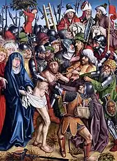 The panels show their artist's special narrative, visual and symbolic language and include lower-class characters.[1] Their interpretation of the Passion recalls the aims of the contemporary Devotio Moderna, which recommended independent scriptural study and a personal relationship with God.[2]