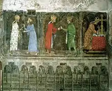Art historians assume that the Master of the Luxembourg Genealogy is also the author of the so-called Relic Scenes in the Chapel of St. Mary and the double portrait of Charles IV and Anna von Schweidnitz with the relic cross (Exaltatio crucis) on the entrance wall of the Emperor's private oratory (St. Catherine's Chapel) at Karlštejn.[5] Before 1360 he probably participated in the initial designs of the decoration of the Chapel of the Holy Cross at Karlštejn and is attributed with the drawings on the walls of the altar area and also the scene of the Adoration of the Twenty-four Elders in the western window niche. The drawings on the wall of the chapel are not just linear sketches, but the faces are modelled by accentuating the highlights with chalk and also by drawn shadows.[6]