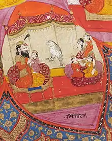 Guru Hargobind, with Mata Nanaki, and four children. From an illustrated and illuminated folio of a Dasam Granth manuscript by Miha Singh of Kashmir, ca.1839–1843