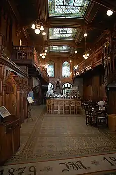 The young Caragiale was sent to school at Anghel Demetriescu's Sfântul Gheorghe College in Bucharest, where he discovered a passion for history and heraldry.[9][10] At around that time, he was probably introduced to Demetriescu's circle, which included the doctor Constantin Istrati, the writer Barbu Ștefănescu-Delavrancea, the physicist Ștefan Hepites, the literary critic N. Petrașcu, and the architect Ion Mincu.[11] During a 1901 summer trip to Sinaia, where he sojourned with the Bibescu family, Mateiu was acquainted with George Valentin and Alexandru Bibescu (in a letter he wrote at the time, he described the latter as "only too crazy and a frantic maniac").[12] His favorite book at age 17 was L'Arriviste, by the French novelist Félicien Champsaur, which, as he himself acknowledged, contributed to his vision of social climbing.[13] In 1903, with Ion Luca, Burelly and their children, he traveled through large portions of Western Europe, visiting Austria-Hungary, Switzerland, Italy and France; during the trip, he recorded the impressions left on him by the various European art trends.[14]