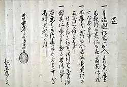 Black seal letter of 1604 from shogun Tokugawa Ieyasu to Matsumae Yoshihiro, first daimyō of Matsumae Domain, granting the Domain exclusivity as intermediaries in trade with the people of Ezo (Hokkaido Museum)