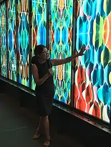 In 2018 McQuillan's first major public artwork, Crystal Blue Persuasion, opened at the 36th Avenue Subway Station in Astoria, New York, a permanent commission by MTA Arts & Design. She translated her signature ribbons of vivid color into geometric patterns, and, building on her practice of using clear acrylic mediums, created floor to ceiling laminated glass windows that span three sides of the station and fill the space with natural light.[25] The title is drawn from the 1969 psychedelic rock song by Tommy James. The repetitive patterns capture the monotonous nature of commuting while celebrating the small variations of each day's journey.[26]