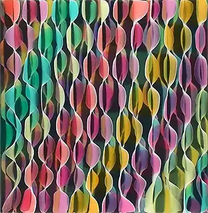 She works on wood panels, layering acrylic polymer, white lines, and translucent ink to create her complicated nets of folding ribbons. The layering creates a sense of luminosity and infinite space.[6] The effect of shifting color and wavering line is subtle and full of movement, described by one critic "as ephemeral-looking as smoke rings."[7]
