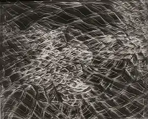 She frequently incorporates skewed and distended grids.[15][16] The negative and positive spaces are equally important, which increases the effect of spatial ambiguity. While her drawings are non-representational, they bring up numerous schematic associations, from an EKG reading[17] to a weather map[18] to a topographic map.[19] Yet "this is a topography of nothing but the artist's vision."[20] They feel like they chart rational and scientific data, yet the optical effects are so strong and destabilizing, they might seem to describe something bigger and more abstract, like cyberspace.[21] David Shapiro describes one piece as the "so–called stellar nursery where the black holes are born."[14] Her drawings develop tension between pure abstraction and the cognitive impulse to create narrative around an image.[22]